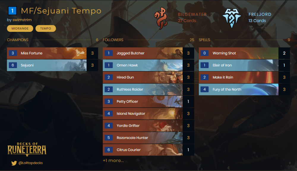 Le deck temporise en jouant des cartes abordables avec des effets de haute valeur (comme Jagged Butcher, Omen Hawk, Petty Officer, Island Navigator), et en allant chercher petit à petit des dégâts sur le Nexus, améliorant Sejuani au passage.