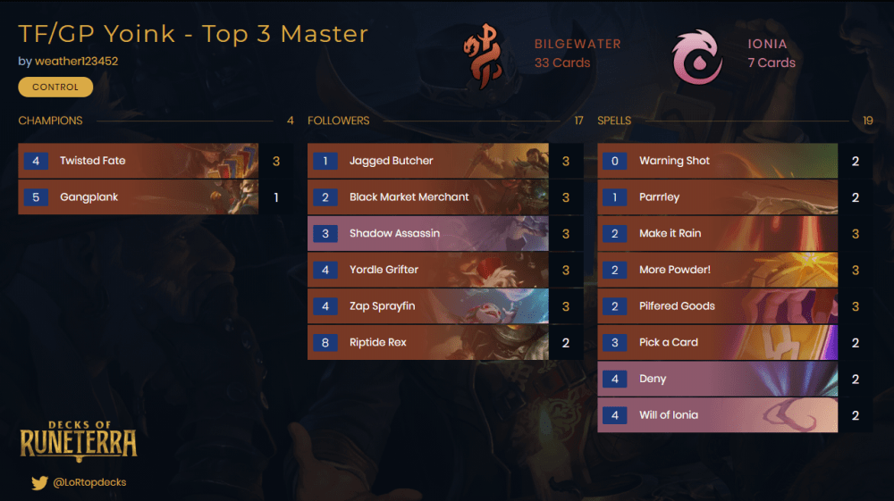 Il génère de la valeur en volant les cartes du deck ennemi avec Black Market Merchant et Pilfered Goods, tout en contrôlant le board grâce à des Kegs et Twisted Fate. Il gagne soit grâce aux cartes volées, soit grâce à un Gangplank ayant gagné un niveau combiné au Riptide Rex.