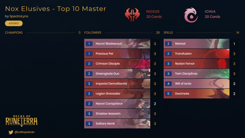 Un nouveau deck est apparu dans les métas orientales : le Nox Elusives. Très apprécié des joueurs de l’archétype sans champion Burn Aggro, il se joue d’une manière très proche, infligeant énormément de dégâts direct avec les Elusives ainsi que Crimsom Disciple / Imperial Demolionist, et finit le travail grâce à des Decimate et des sorts de bonus d’attaque.