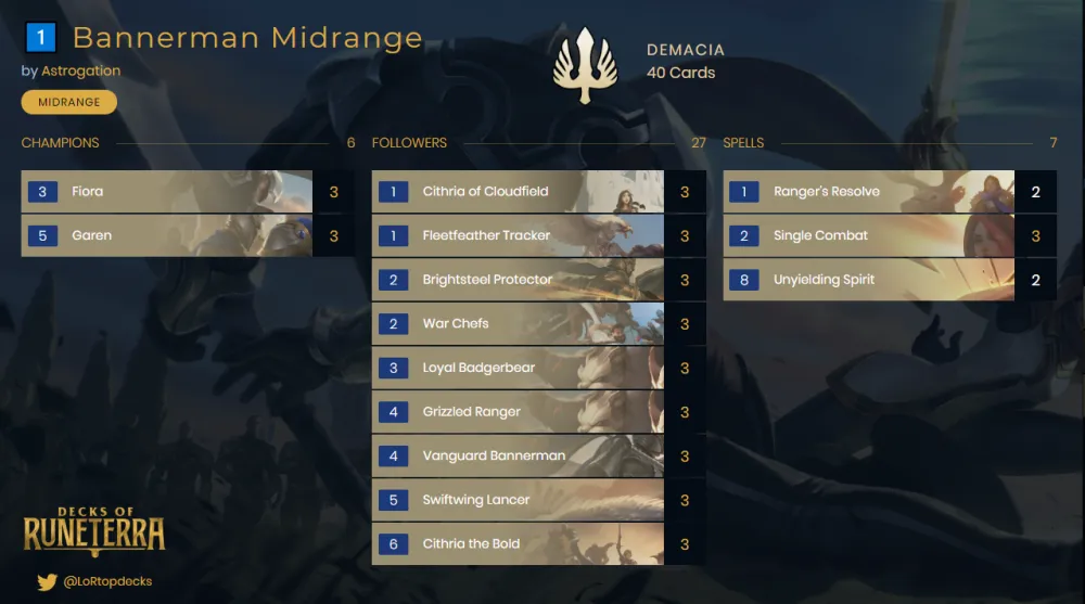 Le deck utilise la même courbe de progression que le Bannerman Midrange, mais est beaucoup plus agressif. Avec Relentless Pursuit, il peut même attaquer trois fois dans un même tour, infligeant de lourds dégâts directs au Nexus grâce à la compétence de MF.