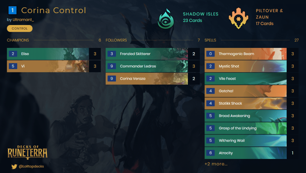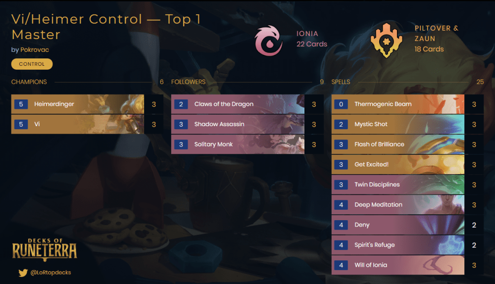 Proche du deck Heimer / Karma control, il remplace ici Karma par Vi pour les mêmes raisons que dans le deck Corina Control. De plus, les deux Claws of the Dragon viennent gratuitement lorsque vous utilisez deux sorts, et Deep Meditation est un des meilleurs sorts de draw dont dispose Ionia.