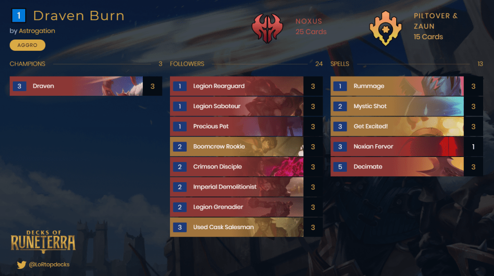Draven Burn est le digne successeur du deck de la bêta Draven / Jinx Discard. Il se base sur l'Imperial Demolitionist : une unité qui inflige 1 de dégâts à un allié pour infliger deux dégâts au Nexus ennemi.