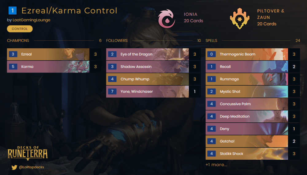 Une version un peu différente est le Ezreal / Karma control. Plus compliqué à jouer, ce deck se glissera mieux dans les mains d'un joueur confirmé. C'est un deck control très satisfaisant à jouer, mais qui paraît moins accessible que le reste de cette liste.