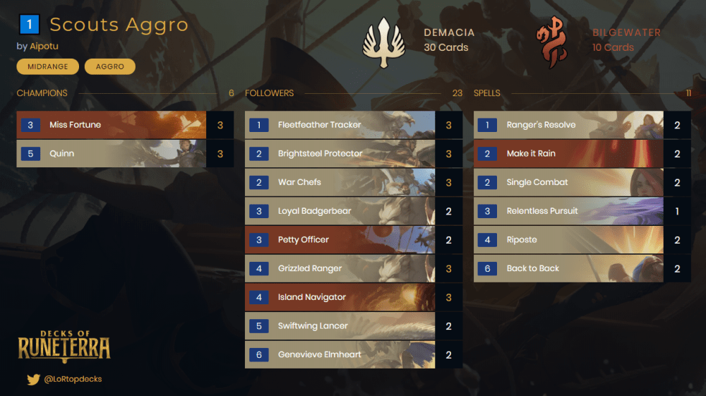 Le deck Scouts Aggro est toujours en place, et utilisement parfaitement la synérgie entre Miss Fortune et les doubles attaques des Scouts, lui permettant de level up après seulement deux rounds d'attaque.