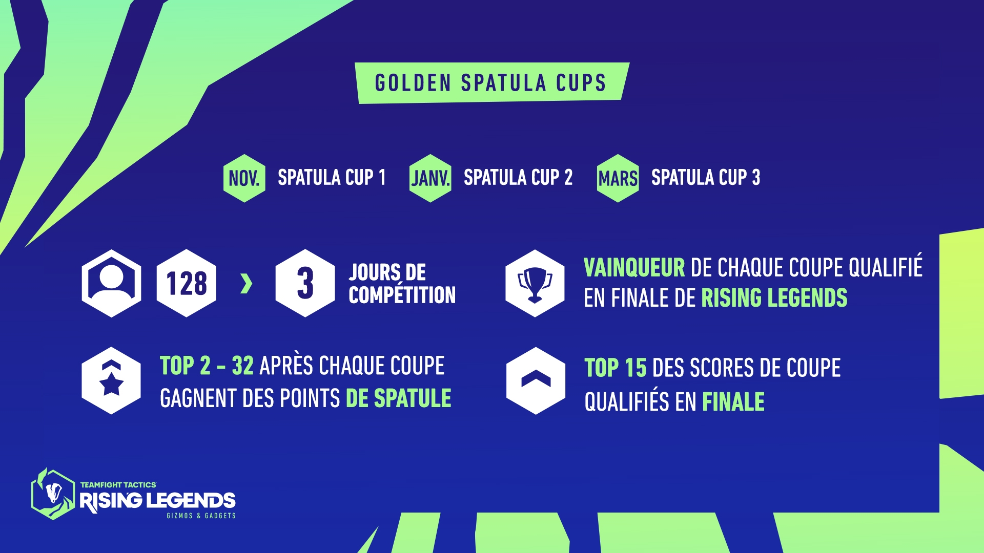 L’année compétitive est divisée en plusieurs parties. Les Golden Spatula Cups (GSC) font office de tournois de qualifications où le vainqueur de chaque édition est directement qualifié pour l’ultime tournoi qualificatif : le Rising Legends. Le premier joueur à s'être qualifié est Français, puisque Mamène, joueur pour MCES, a remporté la GSC#1 s’offrant ainsi un ticket pour le Rising Legends.