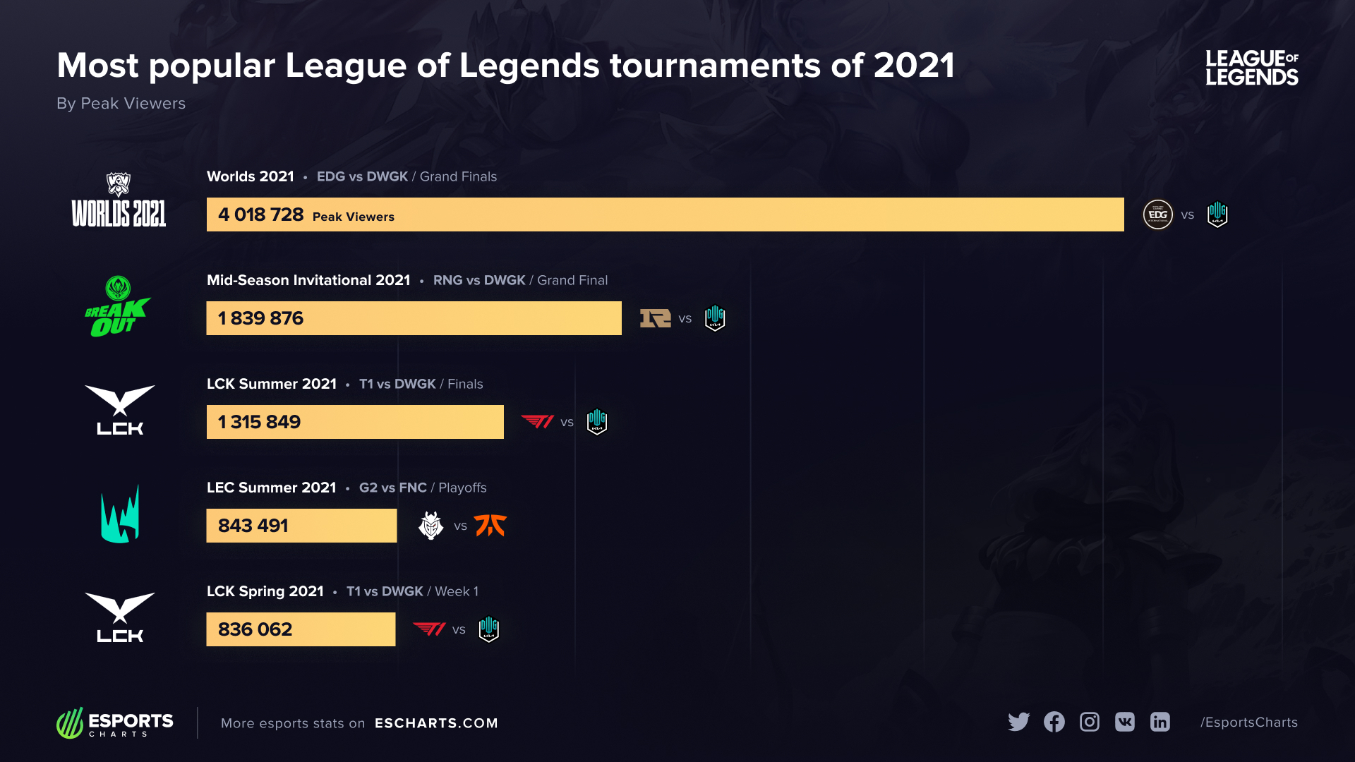 D'après le premier bilan établi par Esports Charts, les Worlds de League of Legends, le Mid-Season Invitational et la LCK Summer Split ont été les tournois les plus populaires de l'année 2021.