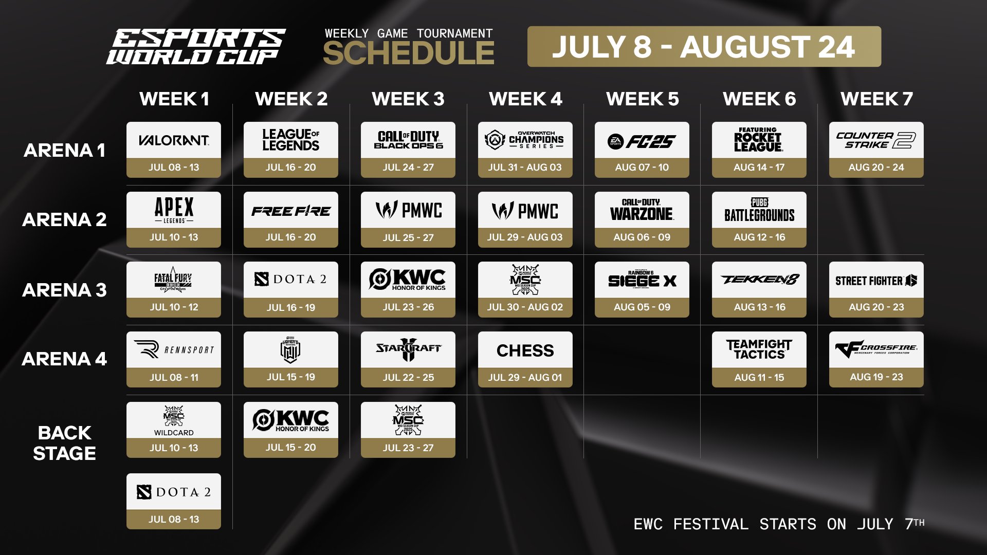 La compétition débutera par le EWC Festival le 7 juillet, puis les tournois s’enchaîneront jusqu’à la grande finale du 24 août. Parmi les temps forts annoncés : League of Legends du 16 au 20 juillet, Rocket League du 14 au 17 août, ou encore Street Fighter 6 du 20 au 23 août.