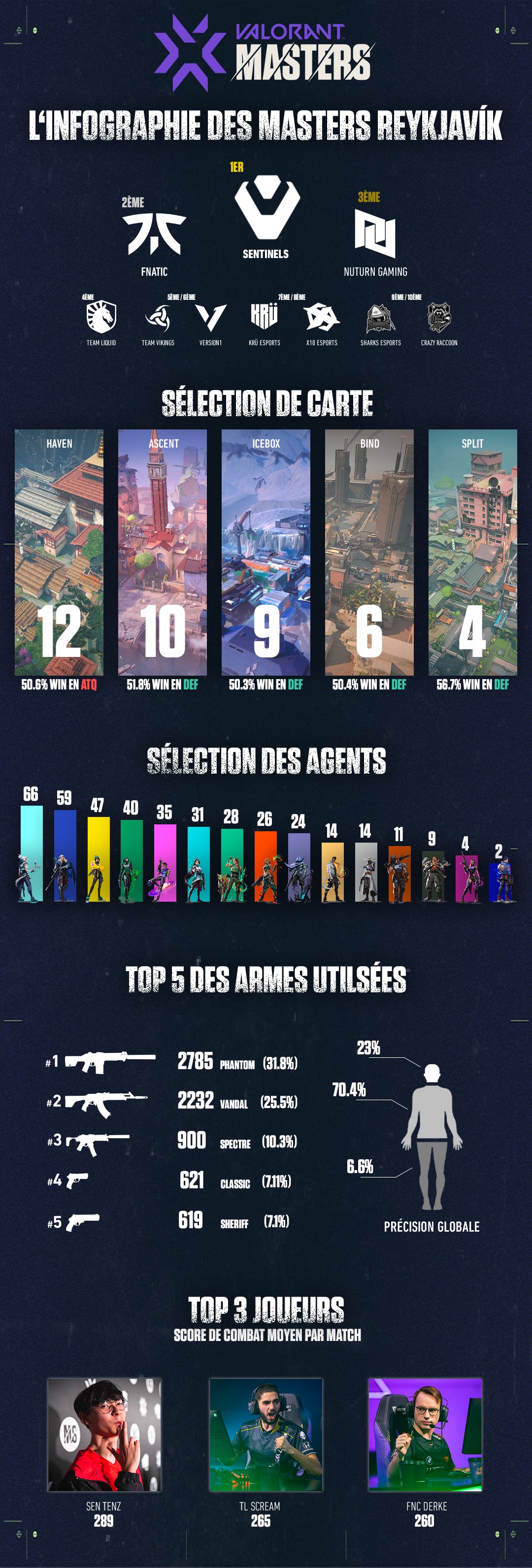 Le Valorant Champions Tours va maintenant faire un break afin de préparer le Stage 3 du circuit 2021. Riot Games profite de cette accalmie pour faire un premier bilan des Masters - Reykjavík avec une infographie spéciale ; à la fin de cette présentation, Riot Games a mis en avant les trois meilleurs joueurs du tournoi, à savoir TenZ de l'équipe Sentinels, Scream de l'équipe Team Liquid et Derke de l'équipe Fnatic.
