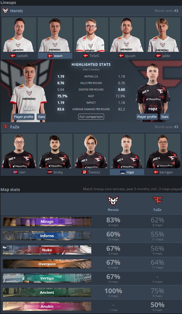 Si FaZe ne semble pas en grande forme au moment d’entrer dans ses quarts de finale, il ne faut pas négliger la grande expérience des joueurs qui la compose. À Paris, broky et ropz ont fait le plus gros du travail quand Twistzz et rain sont restés plus discrets, notamment face aux BNE où l’équipe aura eu beaucoup de mal à tirer son épingle du jeu. De l’autre côté, le trio stavn, jabbi, cadiaN fait fureur face à ses concurrents, mais devra faire attention à ne pas plier sous la pression comme lors de la finale des IEM Rio face à Vitality le mois dernier. Pour terminer, disons que le match présente des enjeux bien plus que sportifs puisque ces deux structures sont en difficulté financière depuis quelques mois déjà. Une victoire lors de ce match ferait de l’équipe gagnante l’une des grandes favorites pour accéder à la grande finale, car le prochain match les opposera à Monte ou GamerLegion. Une place en finale de major n’est jamais sans conséquence et surtout en ce qui concerne les ventes de stickers ...