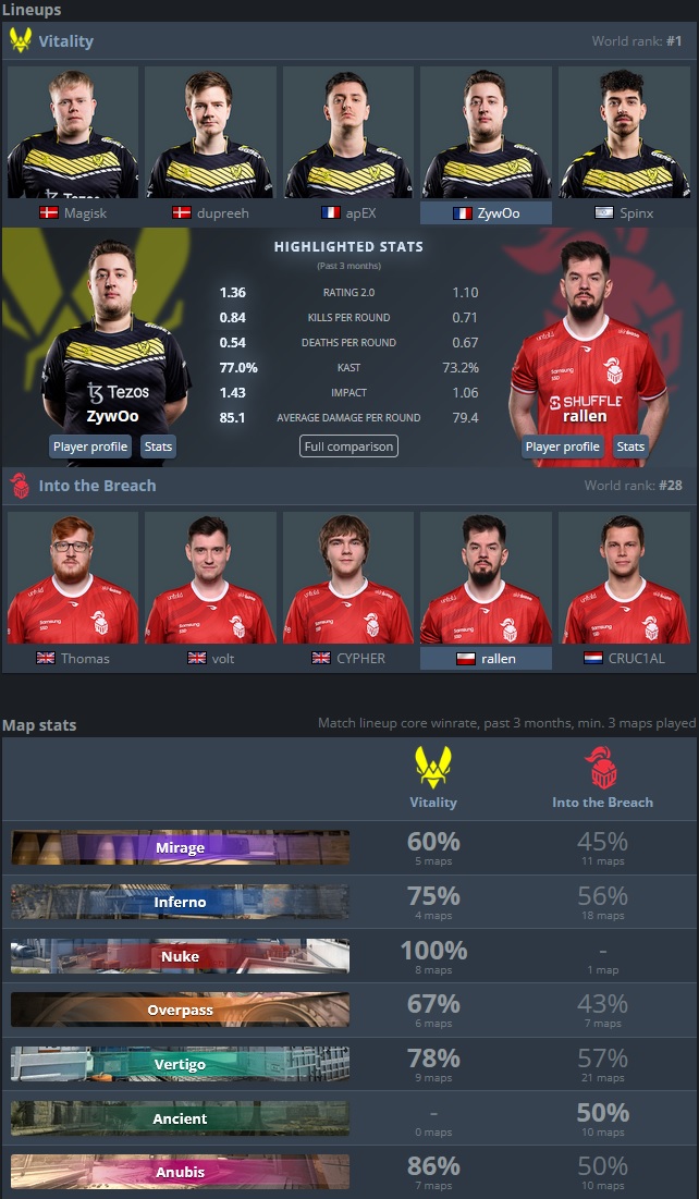 Les "locaux" de l’épreuve, Team Vitality, vont disputer le deuxième quart de finale de ce Major face à l’une des surprises de la compétition : Into the Breach. C’est donc un crunch France - Angleterre qui s’annonce pour ce deuxième match de la journée. Les Vitality, tout comme Heroic, n’ont pas perdu le moindre match en Legends Stage face aux G2, ENCE et Monte. Les coéquipiers de ZywOo sont en forme et sont les grands favoris du match de ce soir. Portés par leur victoire à Rio il y a de cela un mois, les Européens sont sur leur lancée et le momentum parle en leur faveur, mais attention, un match piège risque bel et bien de leur faire face ... Into the Breach ! L’équipe britannique n’a clairement rien à perdre lors de ces quarts de finale. Après avoir mis en déroute bon nombre de vos pick'em, la bande à CRUC1AL arrive à Bercy dans une dynamique aussi resplendissante qu’inattendue. Sortants en 3-2 de la ronde suisse du Legends stage, les Anglais n’ont pas réussi à l’emporter face à Liquid et Apeks, mais se sont rattrapés face aux trois cadors qu’étaient Fnatic, ENCE et FaZe. Certes, fnatic est la seule équipe à s’être inclinée en bo3, mais de quelle manière.