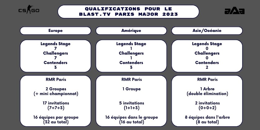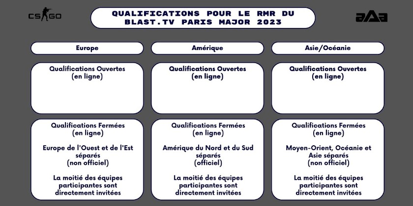 Autre nouveauté qui n'impactera que l'Asie/Océanie, c'est la fin du RMR à quatre dont beaucoup se plaignaient là-bas. Il y aura donc en 2023 huit formations qui auront la chance de pouvoir remporter l'un des deux tickets mis en jeu dans la région. Elles se retrouveront dans un arbre à double élimination en Best of Three (BO3). Autre point pour conclure et qui pourrait avoir son importance, les invitations distribuées au RMR sont divisées de manière égale entre les différents groupes des qualifications fermées, au cas où il ne serait pas possible de distribuer de manière équitable ces places (par exemple 3 places à donner pour seulement 2 groupes), alors la dernière sera d'office accordée à l'équipe qui terminera avec le classement le plus haut et qui sera également la mieux placée dans le futur classement régional édité par Valve (il n'y aura par conséquent pas de match supplémentaire pour départager les éventuelles écuries à égalité au sein des différents groupes régionaux).