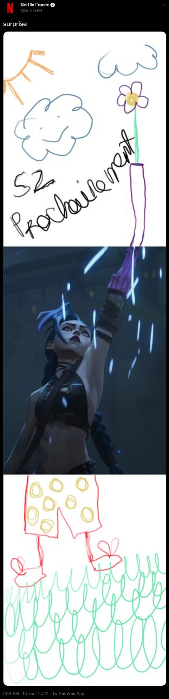 Pour le moment, les informations sur la saison 2 sont très minces, mais nous pourrions en savoir un peu plus d'ici quelques jours. Alors qu'un documentaire en 5 épisodes baptisé Bridging The Rift, diffusés gratuitement sur la chaîne Youtube League of Legends, a commencé à être mis en ligne le 4 août dernier, Netflix France vient de publier sur son compte Twitter une image mettant en scène l'un des principaux personnages de la série, Jinx, avec le mot suivant : "S2 Prochainement". Bien qu'on ne sache pas encore de quoi il advint, nous devrions avoir plus d'informations dans les jours/semaines à venir (à noter que depuis, ce tweet a été éffacé).