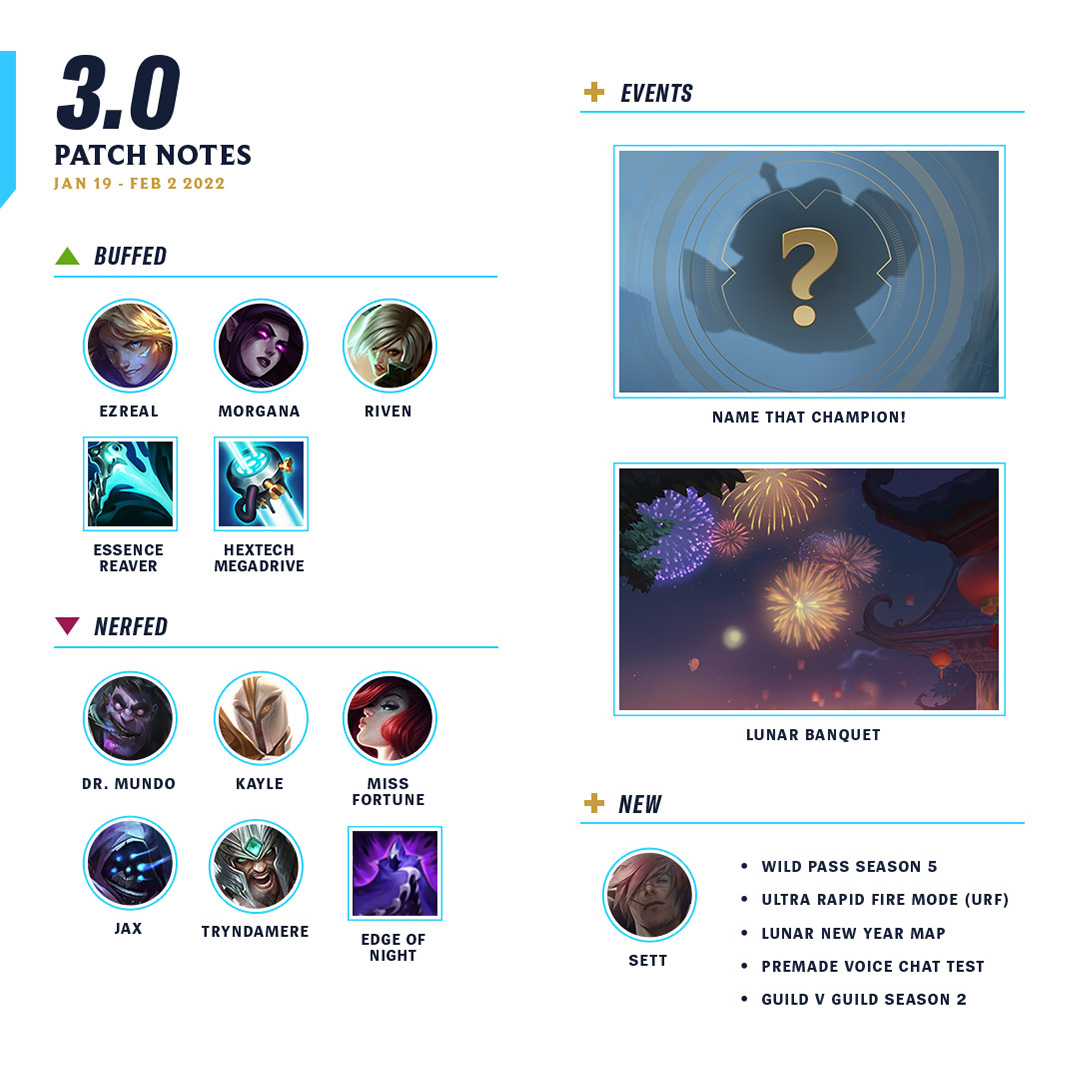 Bienvenue dans le patch 3.0, le tout premier de l'année ! Wild Rift nous promet des nouveautés passionnantes cette année et nous avons hâte de les partager avec vous. Certaines ont même déjà été annoncées récemment. Découvrez quelques-unes de ces annonces dans la vidéo de lancement de la saison 2022 ici. Cependant, contrairement à nos amis de LoL sur PC qui lancent leur nouvelle saison, nous sommes toujours immergés dans la saison 4. Les nouveautés les plus relevées ne sont donc pas pour tout de suite. Après ce patch, nous mettrons en pause les modifications d'équilibrage jusqu'à Par ailleurs, notre prochain patch d'équilibrage aura lieu à la mi-février.