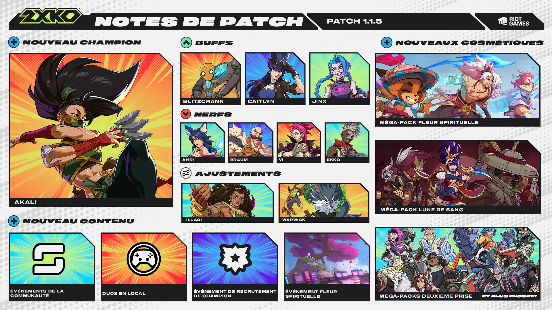 Découvrez toutes les informations concernant les Patchs 1.1.5. Au programme avec cette nouvelle mise à jour : l'arrivée d'Akali, le mode Duo local, un événement Fleur spirituelle, et bien plus encore.