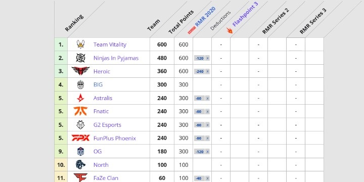 Si la BLAST Premier: Spring Showdown 2021 ne permettra pas de gagner des points qualificatifs pour le Major de Valve, le Flashpoint 3 sera donc comme dit plus haut le premier événement de l'année à permettre d'en empocher et ainsi chambouler le classement. A ce jeu là ce sont les Vitality les premiers actuellement avec 600 points acquis l'année dernière, ils sont suivis par les Ninjas In Pyjamas 480, puis les Heroic 360. Sachant que le Flashpoint 3 permettra aux premiers de remporter 1600 points, le tableau que l'on connait actuellement n'aura donc que peu d'importance d'ici la fin de la saison. En revanche pour ce qui est des transferts il fallait clairement profiter de la fenêtre qui était ouverte depuis plusieurs mois pour se lâcher. Ainsi OG, NiP et surtout Heroic ne seront pénalisés de 20% du total de leurs points acquis que sur l'année 2020, ils évitent ainsi de perdre trop puisque dorénavant ils repartent de zéro en ayant conservé leur place dans le top 10 assez tranquillement. Pour ceux en revanche qui vont devoir modifié leur composition dans les mois à venir, l'addition risque d'être beaucoup plus salé.