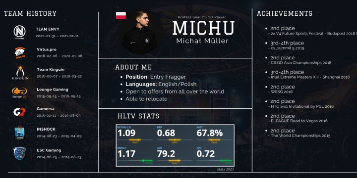 Le Polonais Michał "MICHU" Müller est libre depuis le 23 février dernier, date à laquelle son contrat avec la structure Envy s'est terminé. L'organisation américaine avait en effet fait le choix de mettre un terme à toutes ses activités sur Counter-Strike: Global Offensive le 11 janvier dernier, et donc de placer tous ses joueurs sur la liste des transferts. MICHU était pressenti dernièrement pour rejoindre les nouveaux MAD Lions où il aurait été embarqué par son ancien coach, l'une des vieilles légendes du Golden Five Jakub "kuben" Gurczynski, mais finalement si ce mouvement ne s'est pas fait c'est parce qu'il y aurait eu une autre proposition qui est arrivée entre-temps : celle d'OG. D'ailleurs cette arrivée chez OG ne serait finalement pas une réelle surprise puisque MICHU était déjà sur les tablettes du club fin 2020 lorsque ce dernier commençait à envisager l'avenir sans le Français Nathan "NBK-" Schmitt. Finalement Nathan sera bel et bien écarté en février 2021, mais les dirigeants ont choisi de s'orienter sur Nikolaj "niko" Kristensen pour le remplacer.