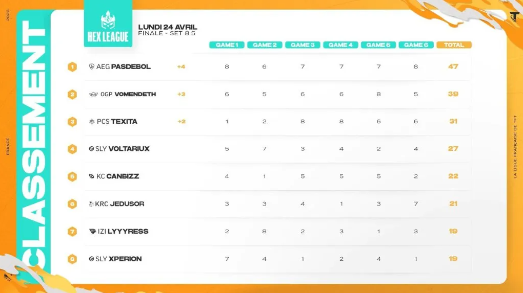 Le 24 avril dernier a eu lieu la finale de la saison 2023 de la Hex League sur le set 8.5 de Teamfight Tactics, une journée spéciale d'affrontement entre les 8 meilleurs joueurs français du circuit qui est venue clore un mois de compétition acharné et qui a également permis à quatre d'entre eux (le top 4) de valider leur qualification pour le Superbrawl. Après avoir fait preuve d'une très grande régularité pendant toute la saison régulière, dominant l'ensemble de la compétition, Laurent "PasdeBol" Cidere, joueur de la formation AEGIS, a été sacré lundi soir champion de France sur TFT.