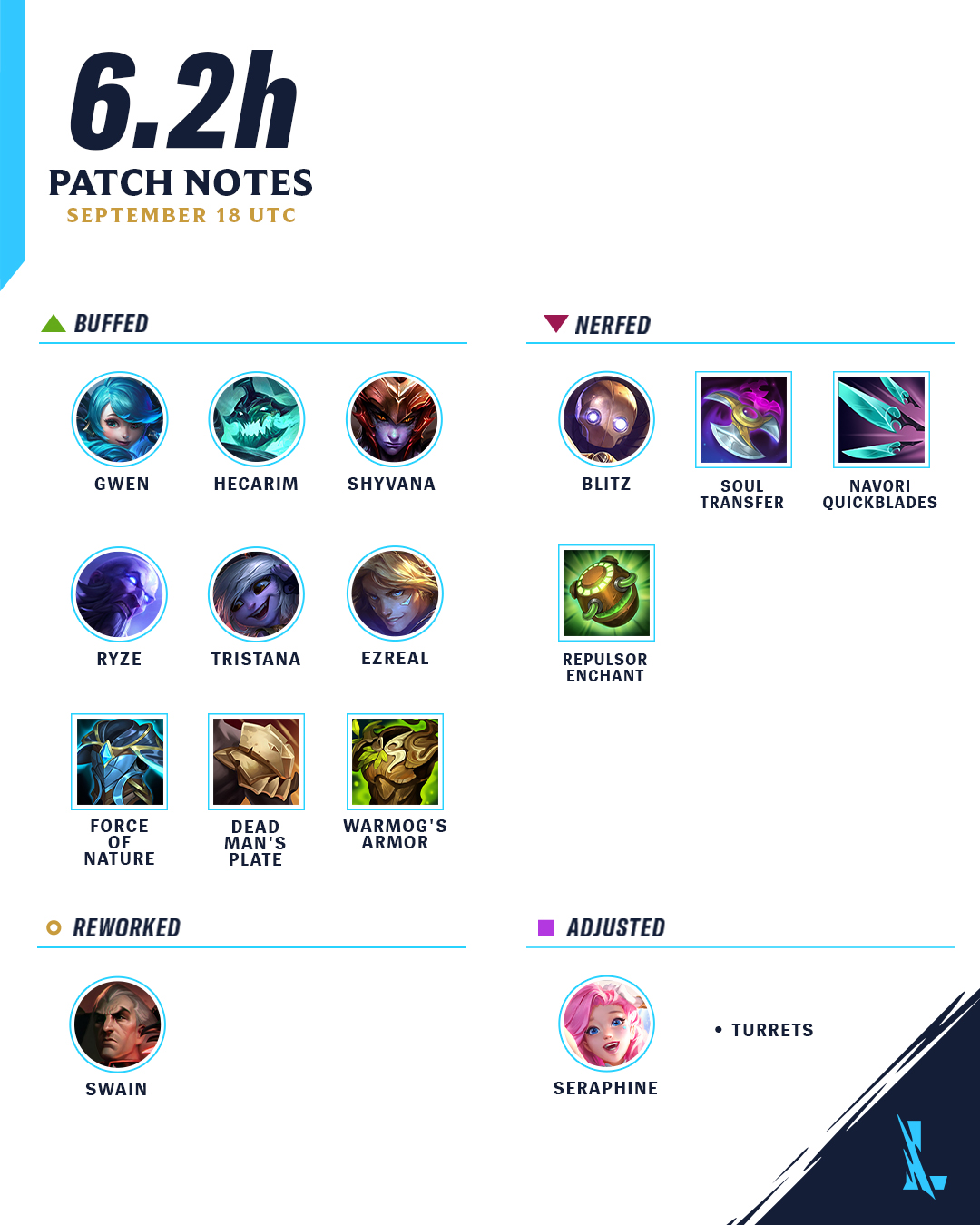 Dans ce patch, Riot Games renforce Gwen, Shyvana et Tristana pour les aider à trancher leurs débuts de partie plus faibles et à tisser plus d'impact en fin de partie. D'autre part, Riot Games veut également qu'Hecarim puisse charger droit vers ces dives et combats d'équipe, alors Riot Games lui apporte un peu d'aide. De plus, Riot Games apporte quelques ajustements à Ezreal et Ryze, tout en aidant Séraphine à atteindre une note plus élevée avec une flexibilité mieux équilibrée. Et enfin, Blitzcrank va subir quelques ajustements afin que le choc de ses engagements soit, eh bien… moins choquant.