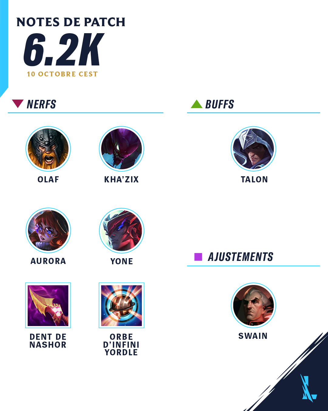 Dans ce patch, Talon fond sur ses ennemis avec des griffes encore plus acérées qu'auparavant, car nous augmentons les dégâts de son ultime pour l'aider à incarner davantage le rôle d'assassin. Nous avons également remarqué qu'Olaf était un peu trop difficile à gérer sur la voie, c'est pourquoi nous ajustons une partie du scaling de ses dégâts, afin qu'il soit plus équilibré en tant que champion de fin de partie. Nous corrigeons également Kha'Zix. Nous avons réduit ses dégâts et augmenté ses délais de récupération, afin qu'il cesse de devenir une telle menace sur la Faille. Le début de partie d'Aurora a été un peu trop puissant, nous réduisons donc une part de ses dégâts afin qu'elle ne domine pas autant ses adversaires en phase de laning. Et enfin, nous réduisons l'efficacité de Yone dans la jungle ainsi que sa robustesse.