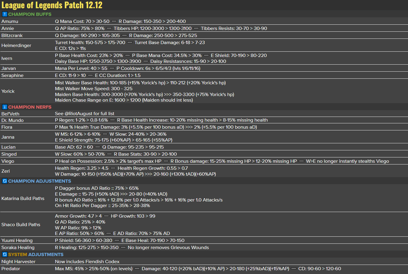 Au lendemain de la publication de la liste des champions concernés par les équilibrages du patch 12.12, Riot Games a dévoilé de nouveaux détails concernant tous ces changements. On peut notamment noter que le coût en mana A d'Amumu est réduit à tous les rangs et son ultime fera plus de dégâts, Jarvan IV infligera plus de dégâts aux ennemis à un rythme plus rapide grâce à un nouveau temps de recharge sur son passif, Annie recevra une légère augmentation du ratio AP de son Q et profitera un peu plus longtemps de la compagnie de Tibbers à mesure qu'il gagnera plus de santé et de résistances, et les dégâts de Blitzcrank sur ses Q et R sont légèrement augmentés.