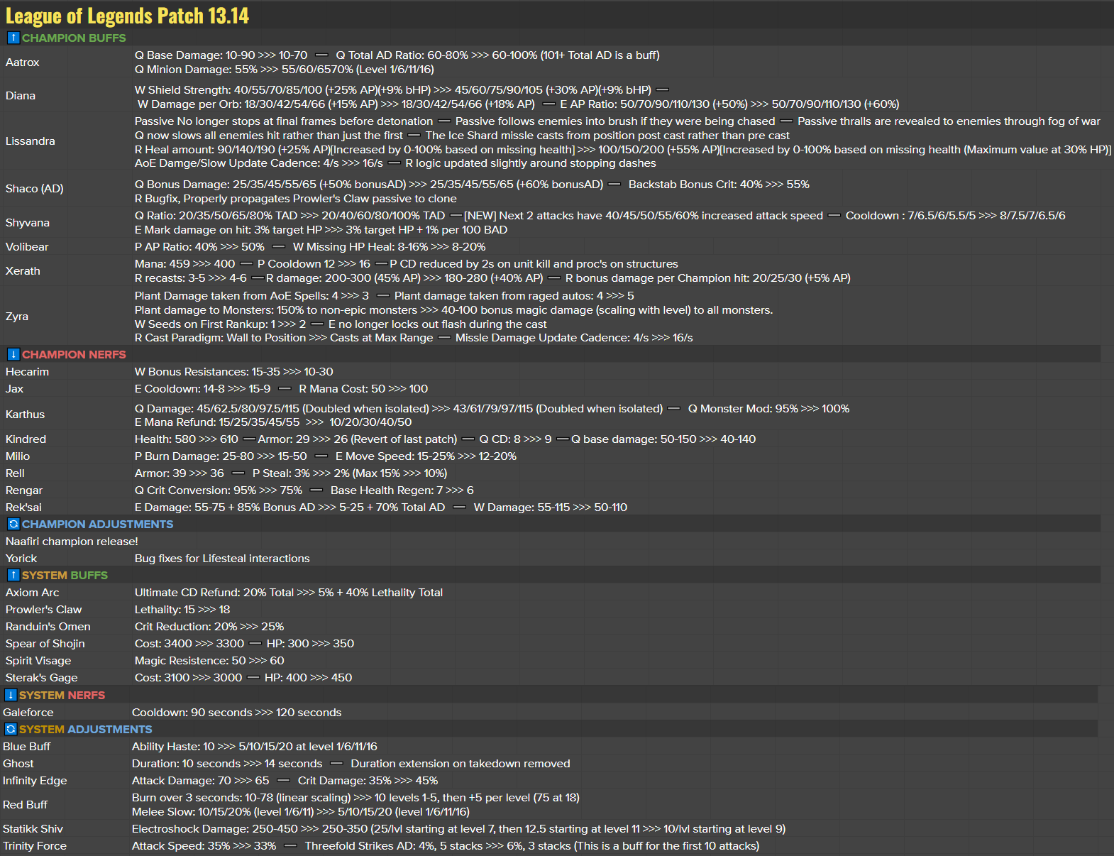 Dans cette nouvelle mise à jour qui sera la quatorzième de cette saison 2023, il est prévu de nombreux équilibrages, un assez gros patch qui fait suite à la pause estivale. Outre la sortie du nouveau champion Naafiri, Riot Games se concentre que le nerf de puissance des early ganks avec principalement un nerf au buff rouge, tout en accordant un peu plus de golds pour compenser.