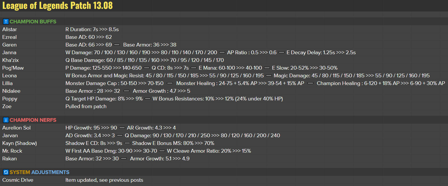 La liste complète de tous les changements et équilibrages sera dévoilée d’ici ces prochaines heures/jours, et pour rappel, le patch 13.8 sera mis en ligne sur les serveurs live la semaine prochaine, aux alentours du 19 avril.