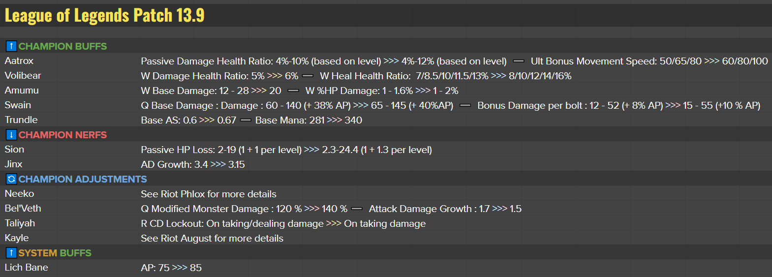 Dans la liste des champions recevant un nerf, nous retrouvons Sion et Jinx, deux champions devenus très populaires avec le dernier patch avec un taux de sélection de 26,6% en moyenne à chaque rang ; le taux de sélection de Jinx monte à plus de 30% au niveau platine, avec un taux de victoire qui dépasse 51%. Quatre champions vont également recevoir quelques ajustements avec le patch 13.9, comme Neeko avec son petit rework (mid scope update) et Kayle, cette dernière recevant des modifications du fonctionnement de son ulti. Kayle verra son jugement divin (R) ajusté afin avec un temps d'incantation réduit d'une seconde, une zone d'effet augmentée et des dégâts réduits à tous les rangs.