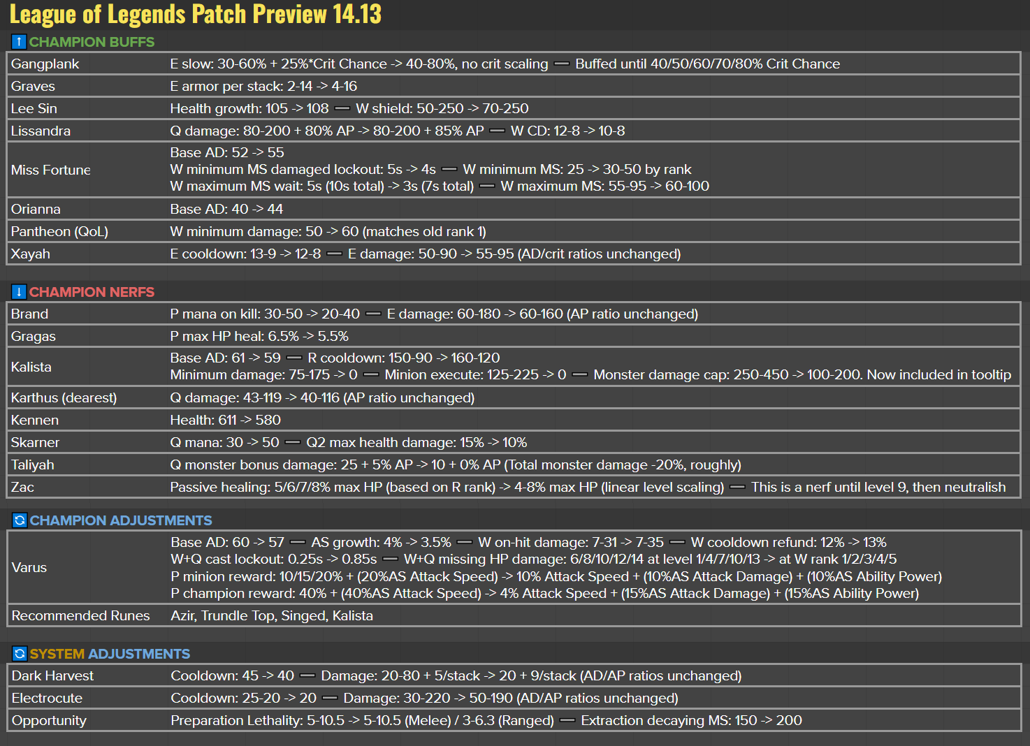 Dans ce patch, Riot Games a pour objectif de différencier davantage Electrocute et Dark Harvest. Electrocute sera désormais orientée vers l'early game, tandis que Dark Harvest s'inscrira davantage dans une logique de stacking. Par ailleurs, Riot Games souhaite que Dark Harvest soit plus avantageuse pour les champions de lane en réduisant son temps de recharge, permettant ainsi une accumulation plus rapide des stacks. Riot Games procède également à des ajustements sur plusieurs utilisateurs de Dark Harvest pour limiter les risques.