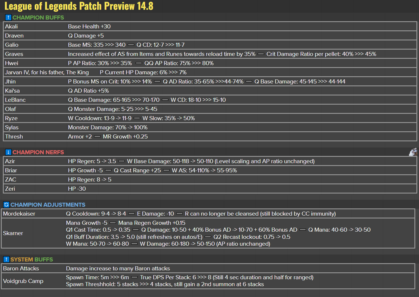 Riot va également apporter quelques changements/ajustements au niveau des Voidgrubs, du Baron, de Skarner et de Mordekaiser. Dans ce patch 14.8, le studio va améliorer les Voidgrubs en augmentant à la fois leurs dégâts et le nombre de grubs requis pour invoquer le premier grub. Par ailleurs, Riot modifie le timing de l'apparition du dragon afin de réduire la fréquence des affrontements et encourager les équipes à s'impliquer davantage dans le combat.