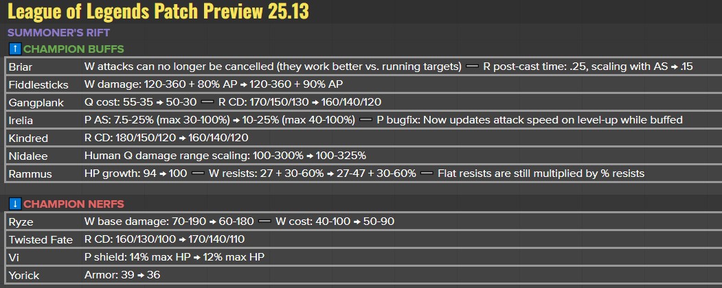 Sur le plan technique, cette mise à jour vient corriger certains déséquilibres ponctuels : des champions légèrement trop faibles malgré un bon profil théorique (comme Nidalee ou Rammus), ou d’autres qui bénéficient un peu trop de leurs derniers buffs (comme Twisted Fate). Riot insiste sur le fait que ces ajustements sont calibrés pour éviter de créer de nouveaux déséquilibres, surtout à l’approche d’un tournoi majeur comme le MSI.