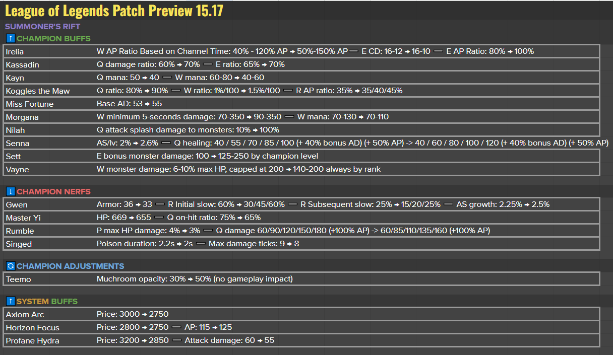 Le patch 25.17 (15.17) sera relativement léger, en attendant les ajustements majeurs de la version 25.18. Quelques buffs expérimentaux sur des builds alternatifs et des nerfs ciblés viennent accompagner un cycle de transition vers le patch compétitif des Worlds.