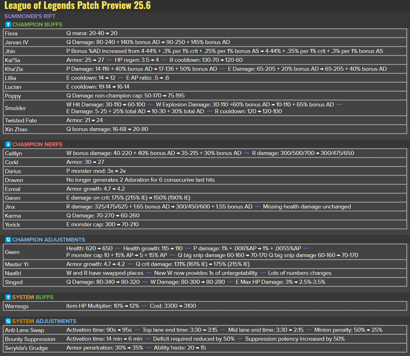 Du côté des buffs, Riot Games cherche à redonner du poids à plusieurs champions qui peinaient à s’imposer dans la méta actuelle. Jarvan IV, Kha’Zix et Xin Zhao, trois junglers qui ont connu des hauts et des bas ces derniers mois, bénéficient d’améliorations qui devraient renforcer leur présence. Jhin, souvent dépassé par d’autres carry AD, reçoit également des buffs, tout comme Lucian, Smolder et Twisted Fate, qui peinent à s’imposer. En revanche, plusieurs champions voient leur puissance réduite afin d’équilibrer les performances. Riot s’attaque notamment à Draven et Ezreal, qui ont affiché des taux de victoire élevés ces dernières semaines. Jinx et Garen subissent aussi des nerfs, limitant leur capacité à dominer les combats prolongés. Master Yi et Karma, souvent difficiles à gérer lorsqu’ils sont en bonne position, voient également leur impact réduit.