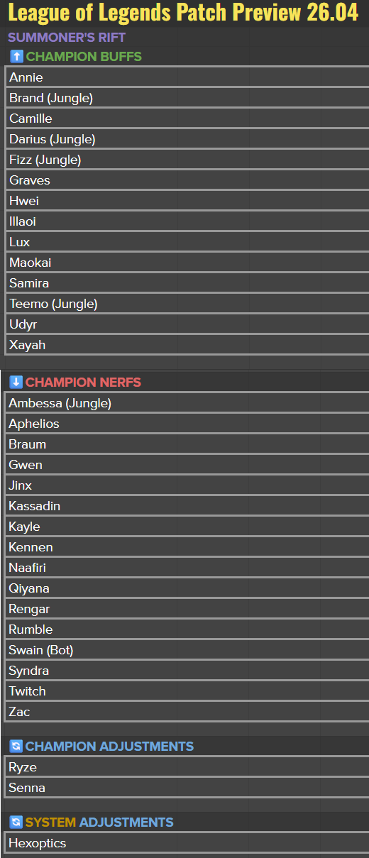 - Buffs notables : Outre les junglers mentionnés, des champions comme Camille, Hwei, Illaoi, Samira et Xayah reçoivent des améliorations. Annie, Graves, Lux, Maokai et Udyr figurent également dans la liste des bénéficiaires.