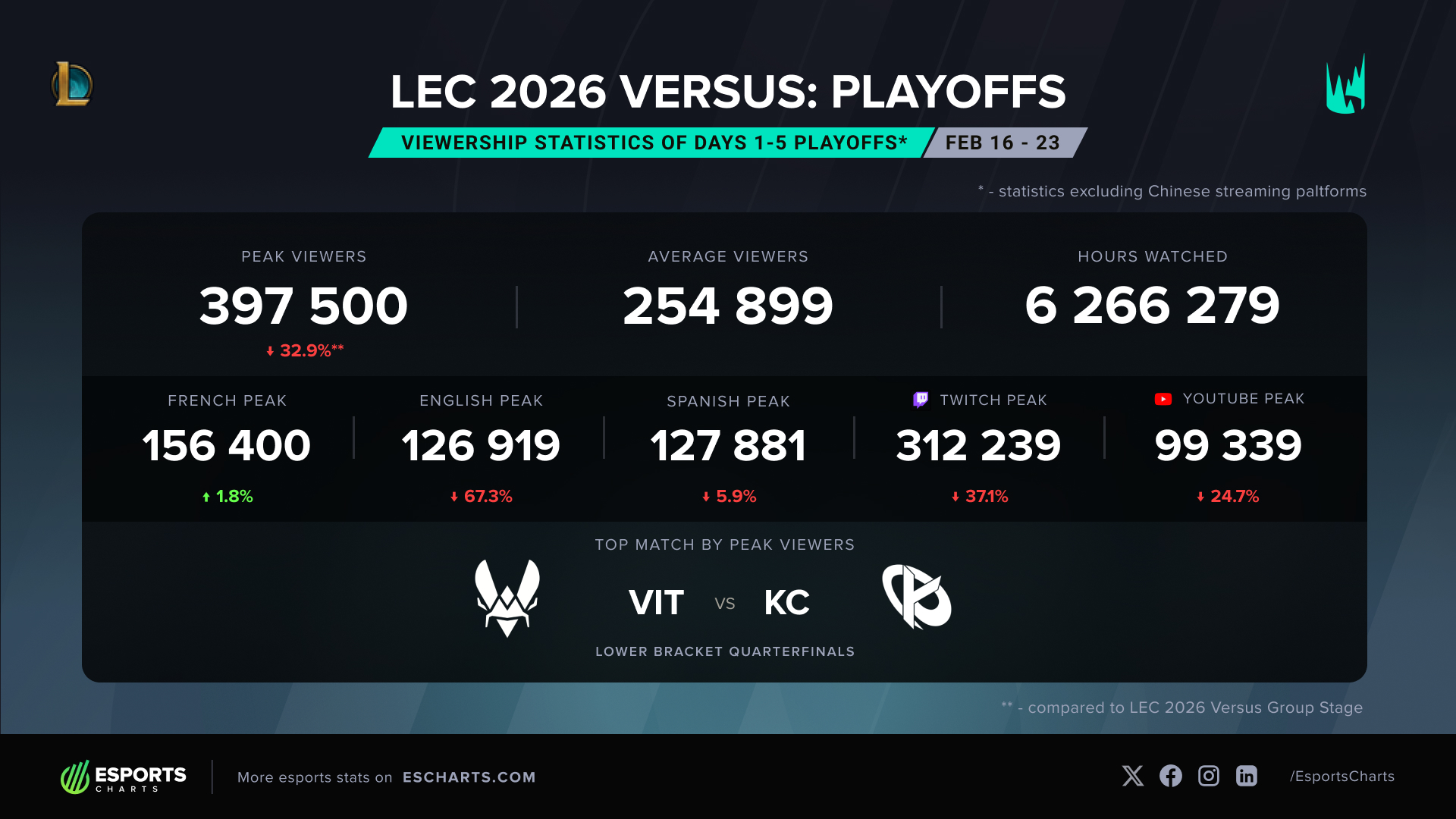 L'analyse des statistiques fournies par la plateforme Esports Charts met en évidence une baisse globale des audiences lors des premiers matchs de ces playoffs par rapport à la phase de groupes. Pour eux, ce fléchissement s'explique principalement par l'élimination de Los Ratones à l'issue de la phase de groupes. L'équipe montée par le créateur de contenu anglophone Caedrel avait agi comme un véritable moteur d'audience lors de la première étape de ce LEC Versus, son dernier match face à Vitality ayant frôlé la barre des 600 000 spectateurs en simultané. Sans cet apport, le public anglophone a enregistré la chute la plus significative du tournoi toujours d'après Esports Charts. Les playoffs se déroulant désormais exclusivement entre des organisations historiques du circuit franchisé, le modèle de diffusion repose de nouveau sur une consommation plus traditionnelle de l'esport, sans le levier massif d'un équipe relativement particulière.
