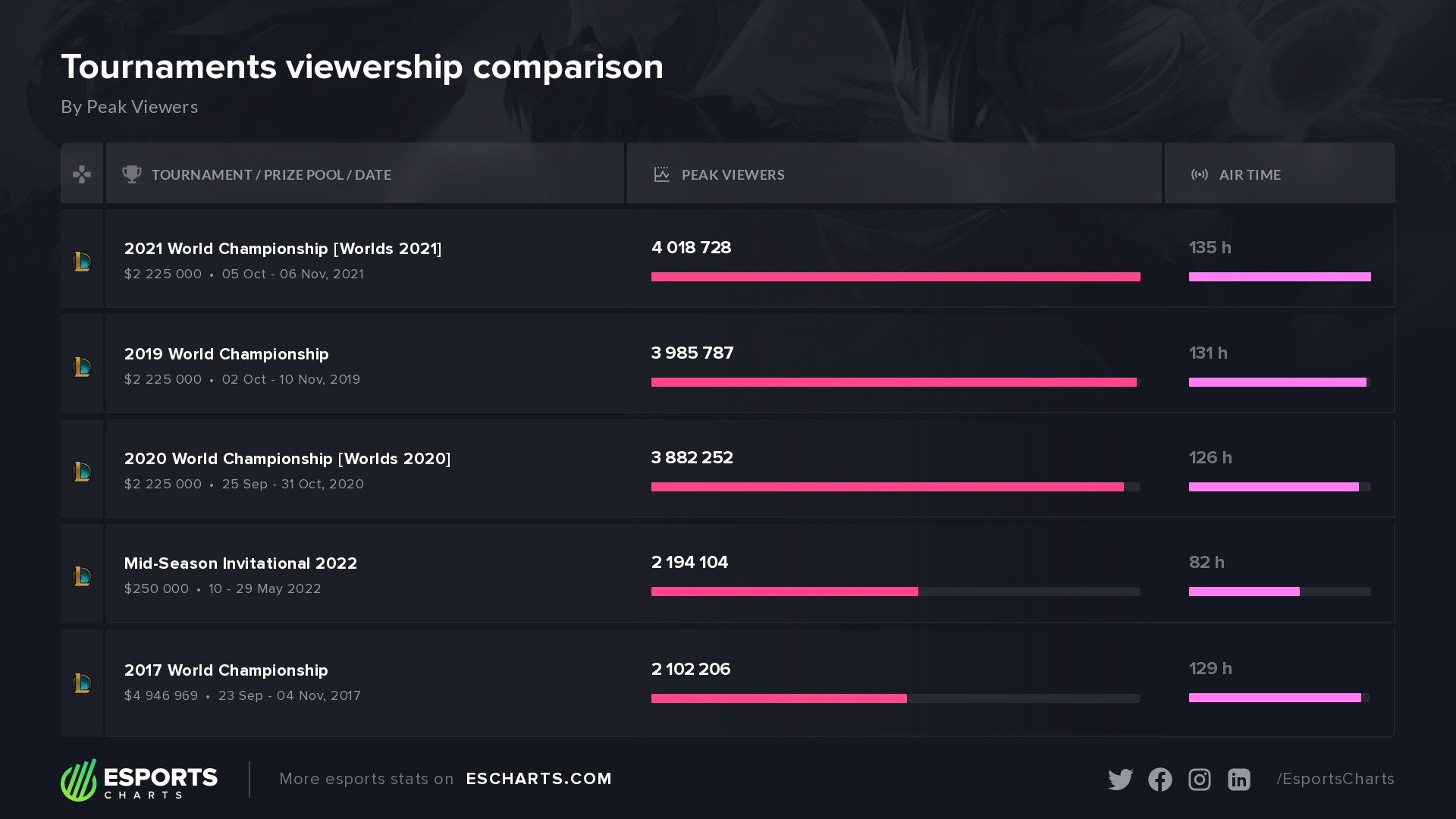 Nouveau record d'audience pour le Mid-Season Invitational 2022 avec plus de 2,1 millions de spectateurs devant la rencontre RNG - T1, la finale du tournoi qui s'est achevé sur un troisième sacre et un back to back de l'équipe chinoise.