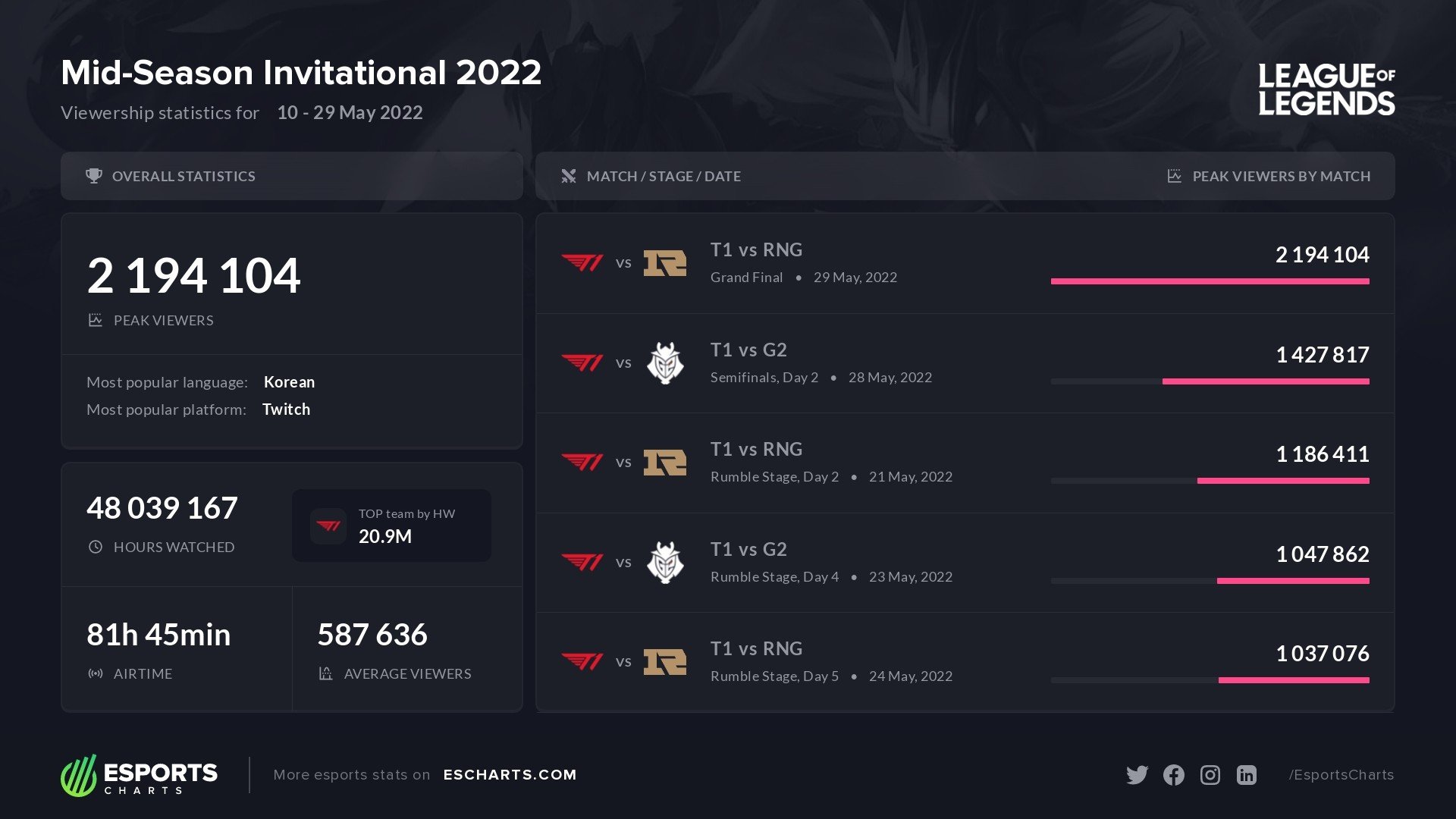 | MSI 2022 | 2 194 104 (T1 vs RNG) |