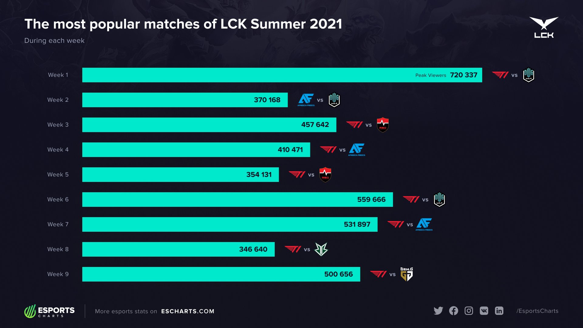 Sans grande surprise, la rencontre qui a enregistré le meilleur pic d'audience de tout le Summer Split est à ce jour le BO5 entre T1 et Gen.G. D'après les données fournies par Esports Charts, ce match a enregistré un pic à 906 901 spectateurs, devenant ainsi la rencontre la plus populaire de cette saison 2021. Avec une finale T1 - DWG KIA qui se profile à l'horizon, BO5 programmé pour ce samedi 28 août à 10h, ce chiffre risque très certainement encore une fois d'évoluer, il pourrait même battre le record du Spring split 2020 ; la grande finale entre T1 et Gen.G avait alors enregistré un pic à 1 074 931 viewers. De manière global dans ce Summer Split, aussi bien la saison régulière que les playoffs, T1 est indubitablement l'équipe qui attire le plus de monde et qui enregistre les meilleures audiences de la LCK.