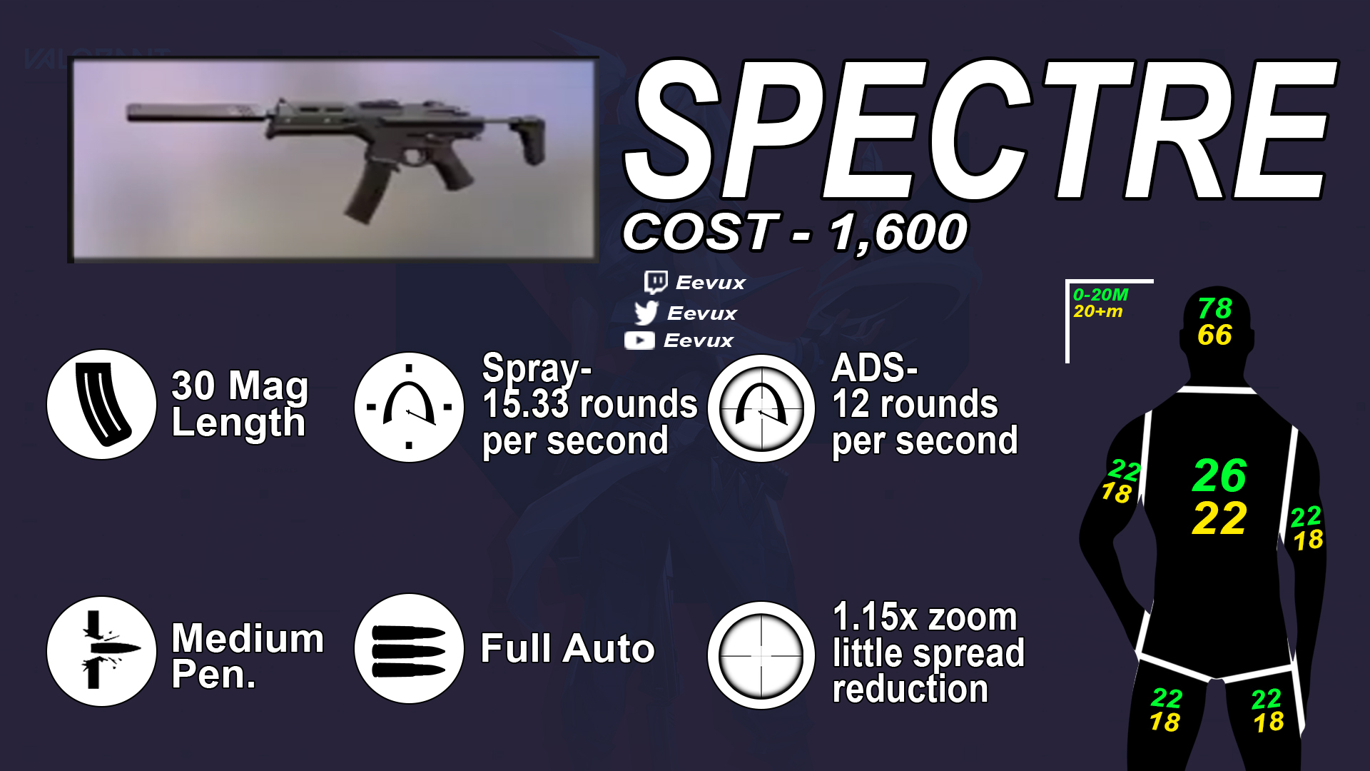 Classe : SMG Prix : 1000 $ Dégats : Wall penetration : basse Munitions / Capacité : 20/60 Zoom : 1.15x Mode de tir : automatique Cadence de tir : 18 rounds/sec Cadence de tir alternative : 4-Round Burst Cadence de tir : 4 rounds/sec |
