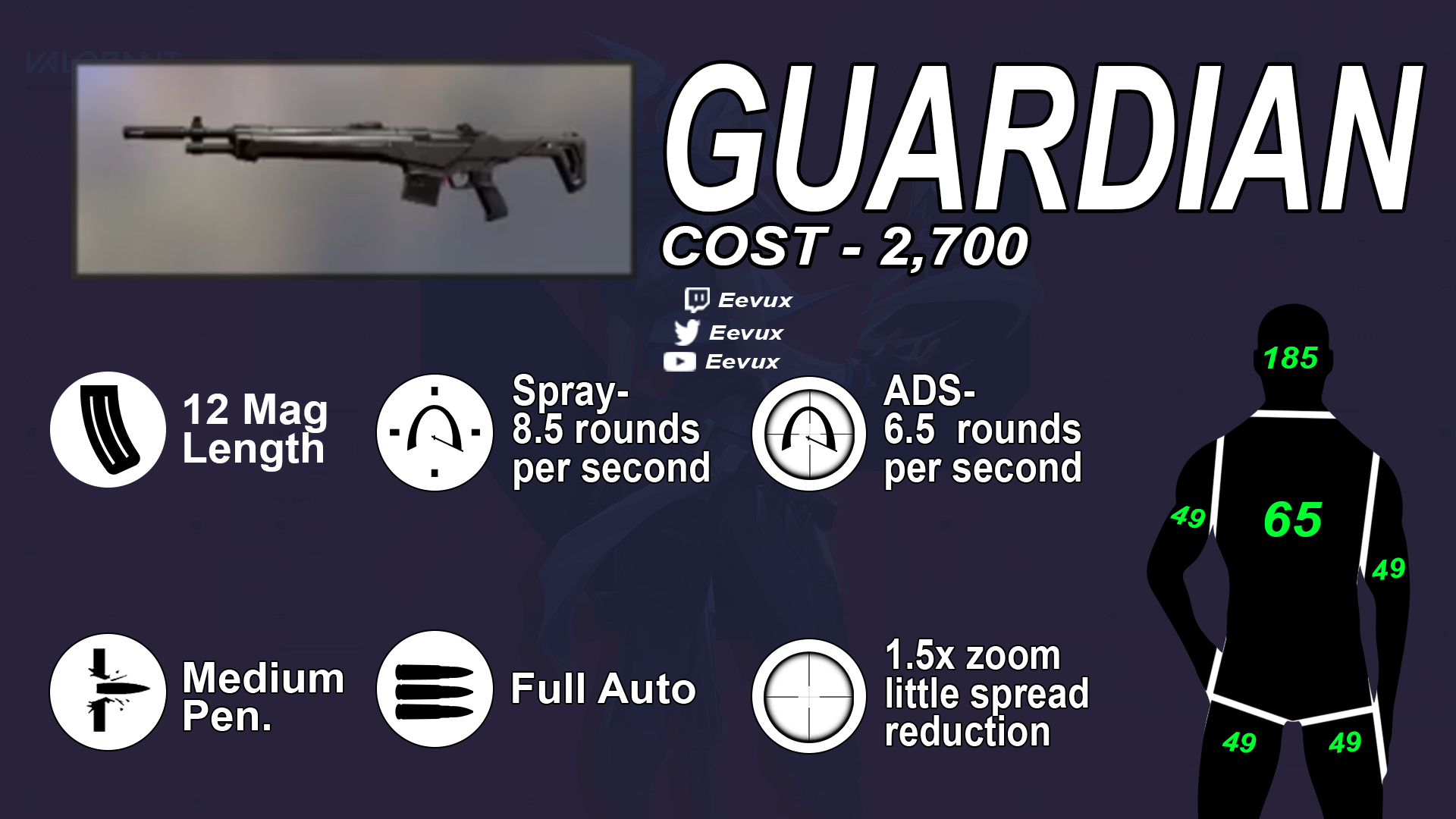 Classe : fusil Prix : 2900 $ Dégats : Wall penetration : moyen Munitions / Capacité : 25/75 Zoom : 1.25x Mode de tir : automatique Cadence de tir : 9.25 rounds/sec Tir alternative : automatique Cadence de tir alternative : 8.32 rounds/sec |