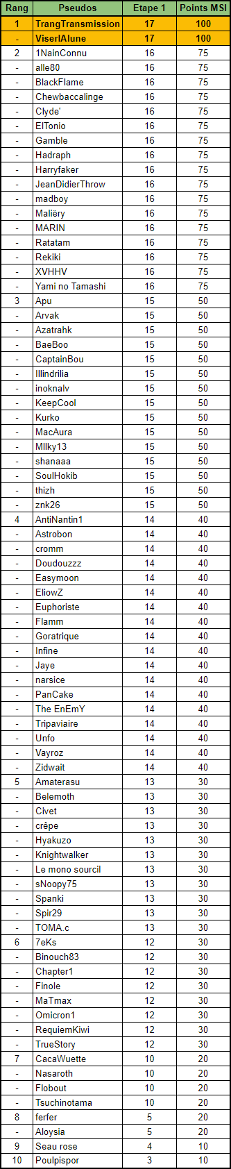 Résultats de l'Etape 1 et classement MSI