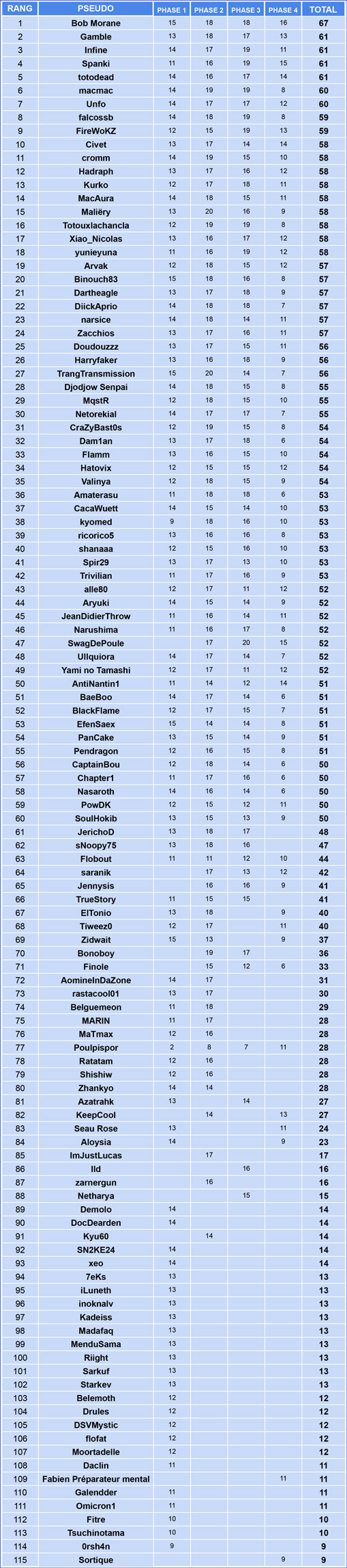 Cette semaine, petite nouveauté : les paris sur les équipes et joueurs leaders en golds et en kills vous rapporteront que 0,5 point. Pourquoi ? Simplement pour limiter les risques d'égalité dans le classement. Allez bon chance.