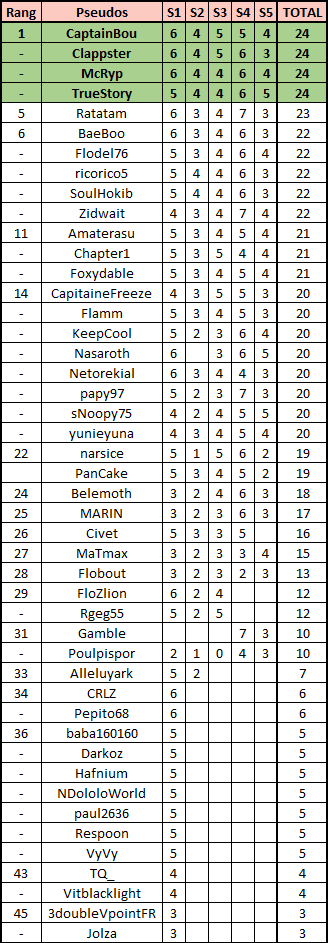 Bref, toujours aimable (il reste cependant toujours dernier parmi les joueurs encore vivants, pauvre tache). Concernant le classement, le suspens est totalement total puisque quatre participants (CaptainBou, Clappster, McRyp et TrueStory) sont au coude à coude en haut de tableau, c'est complètement dingue ! La suite de la saison va nous rendre dithyrambiques.