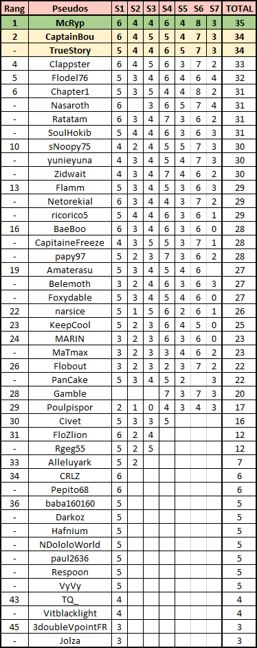 Allez, voici le p'tit classement qui fait plaisir avec un trio de tête composé de McRyp, CaptainBou et Truestory :