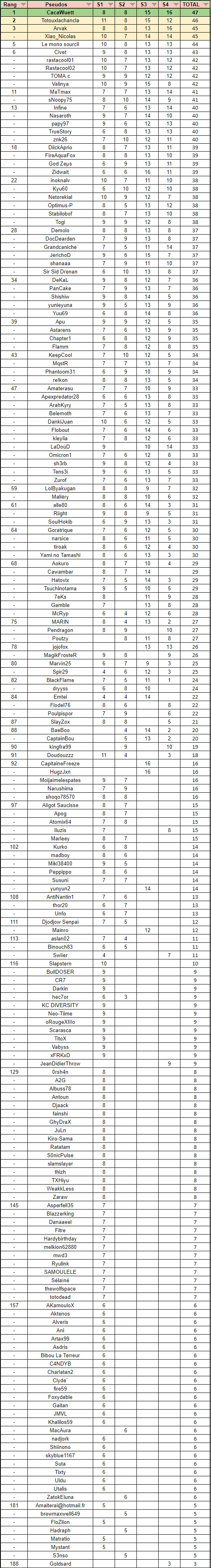 - Ecart en golds (au millier près, dans le bon ordre) à l'issue de la première partie : 5