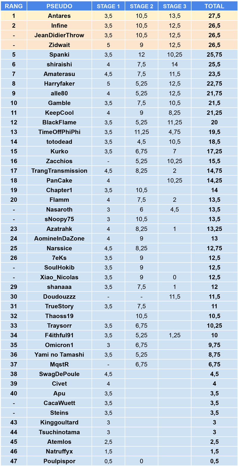 A l'issue de ces trois incroyables phases de pronostics, le haut du classement s'est dégagé tandis que certains semblent encore chercher du pétrole en bas de tableau. Notre grand champion de cette saison est donc Antares, de justesse, qui s'empare du titre grâce à un tout petit point d'avance sur trois personnes : Infine, JeanDidierThrow et Zidwait.