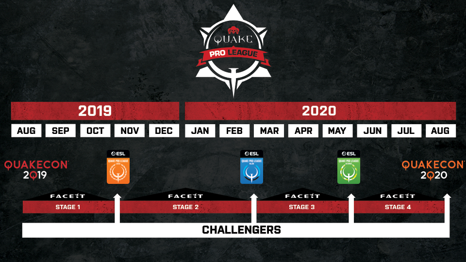 La Quake Pro League a commencé lors de la QuakeCon 2019 et durera jusqu’à la QuakeCon 2020. Les meilleurs joueurs du monde (10 joueurs des régions Amérique du Nord et Amérique du Sud et 10 joueurs des régions Europe et CEI) se sont affrontés à la QuakeCon 2019 pour obtenir un rang au Classement Mondial et inaugurer leur aventure au sein de la Quake Pro League. Un nouveau mode de jeu compétitif, le Duel en temps limité, a été conçu sur mesure pour la Quake Pro League afin que les joueurs puissent faire étalage de toute l’étendue de leur immense talent, tout en leur permettant une plus grande marge de manœuvre et la possibilité d’opérer des retournements de situation spectaculaires pour le plus grand plaisir de leurs fans.