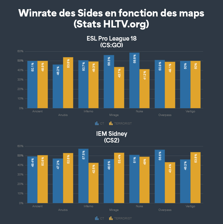 Regardons Nuke par exemple. Lors de l'ESL Pro League, le fameux CT side de Nuke avait un winrate de 58.8%, alors que lors des IEM Sidney, ce winrate CT était descendu à 51%, faisant de Nuke une map équilibrée (sans blague). Inferno et Overpass etaient des cartes très équilibrées à la fin de CSGO, avec moins d'1% d'écart de winrate entre les deux sides sur les deux maps. Mais avec la refonte visuelle, les deux cartes ont vu leur side CT s'envoler à 57.5% et 56.6% respectivement. Pour Mirage, le side T a même dépassé le side CT, passant de 43.7% à 53.4%.