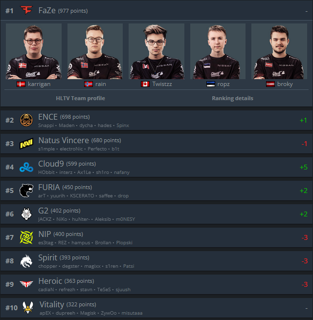 Pour le moment nous retrouvons donc un top 10 dominé par FaZe qui fort de sa victoire au Major, n'a pas su capitaliser sur le momentum à Dallas. C'est donc Cloud9 qui fait pour le moment la meilleure opération, grâce à sa victoire aux IEM, la structure américaine est plus que jamais en position de force en quatrième place du classement. Natus Vincere s'étant récemment retrouvé à quatre joueurs, il y a peu de chances que les jaunes et noirs puissent conserver leur place sur le podium au regard de la bonne dynamique des Russes de chez C9. Dans l'arrière du top 10, BIG se positionne à 24 petits points de Vitality qui vit une passe difficile actuellement et qui pourrait bien sortir du top 10 à Lisbonne si la formation franco-danoise ne performe pas. En effet, BIG avec sa nouvelle recrue gob b, va faire de son mieux pour replacer le drapeau allemand sur la carte mondiale du Counter-Strike.
