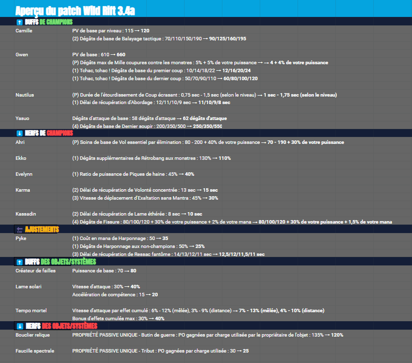 Le patch 3.4a va bientôt faire son apparition sur les serveurs live de League of Legends Wild Rift, et à cette occasion, Riot Games a dévoilé une liste non exhaustive des différents équilibrages qui seront mis en place avec cette mise à jour ; la liste complète de tous les changements sera normalement dévoilée d'ici ces prochains jours. Dans les différents équilibrages dévoilés ce jour, nous pouvons déjà constater une série de buffs pour Camille, Gwen et Nautilus, alors que Ahri, Ekki et Evelynn vont recevoir un nerf.