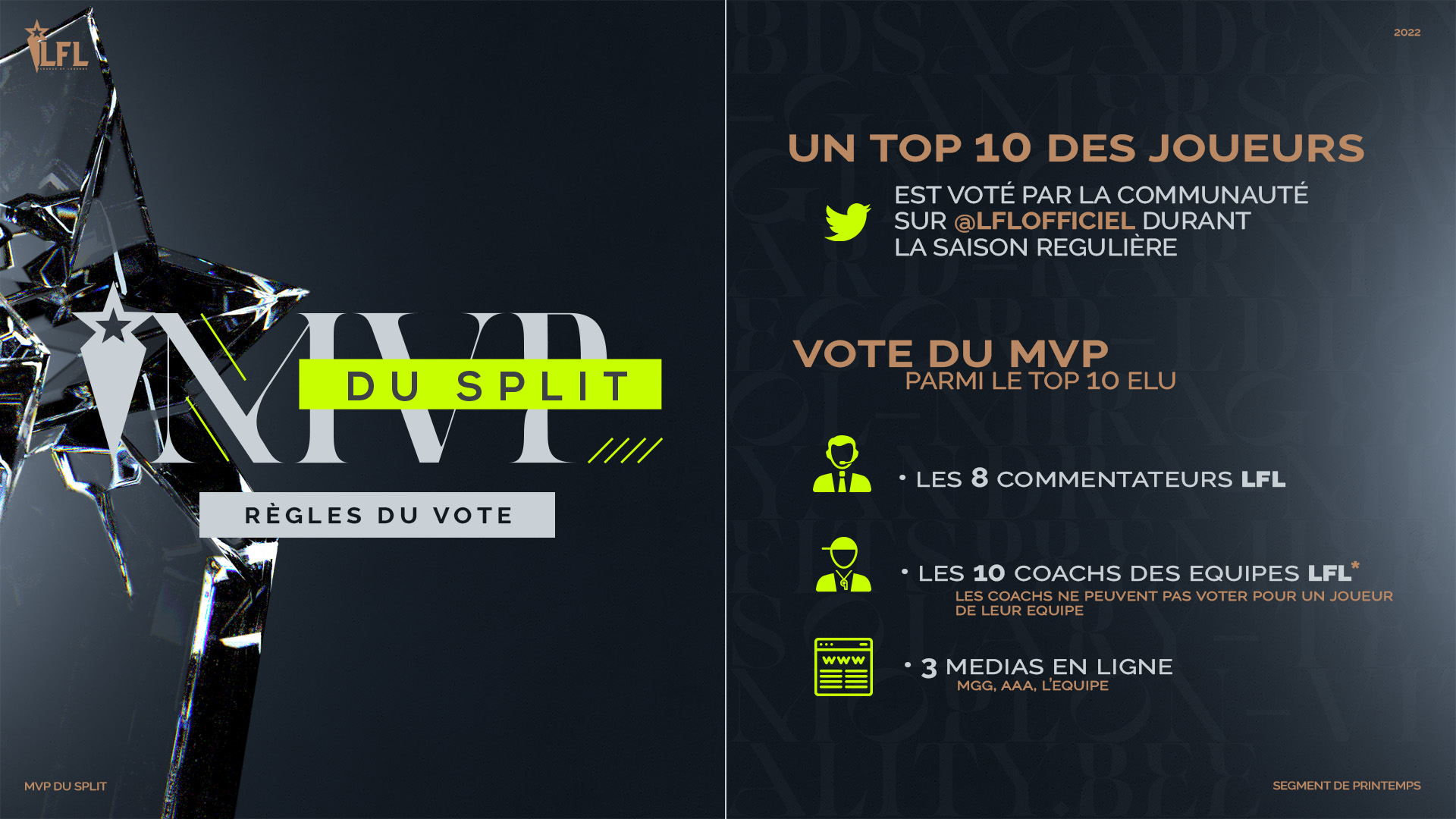 - Un parterre composé des 8 commentateurs de la LFL, des 10 coachs des équipes LFL et de 3 médias (MGG, *aAa* et l'Équipe) procède au vote du MVP parmi le top 10 élu